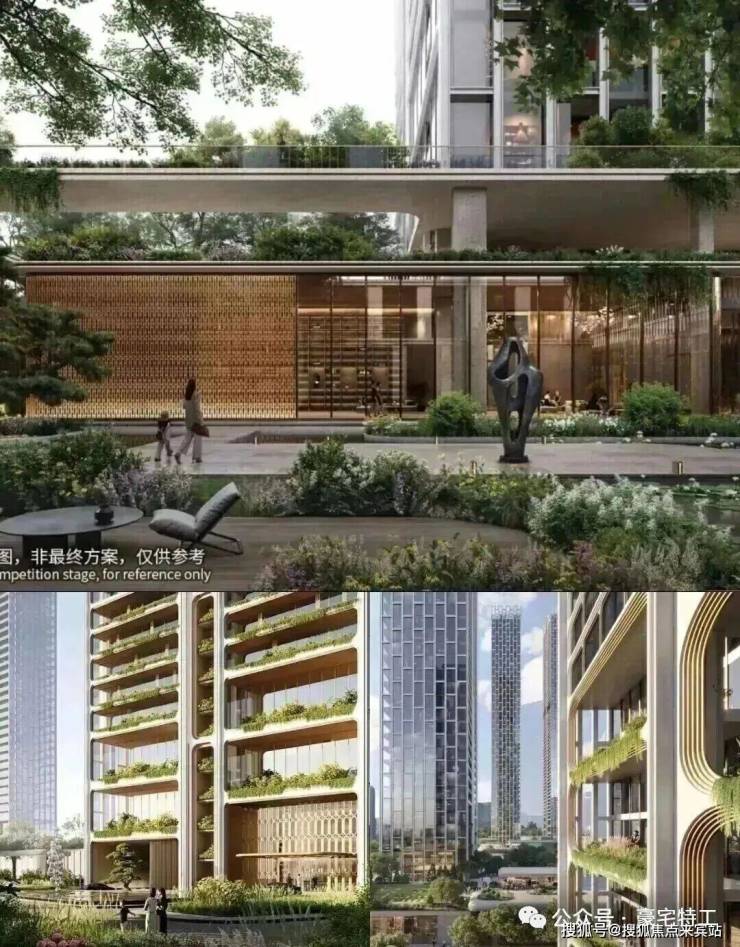 项目规划5栋超高层住宅,采用全玻璃幕墙设计,实用率超95%,主力户型为209㎡以上大平层。项目以“第四代住宅”标准打造,配备空中连廊、星空会所、架空泳池等共享空间,并融入垂直绿化体系