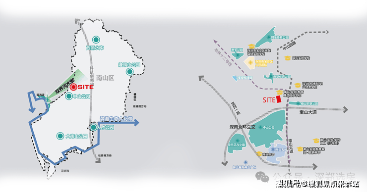 位于深圳南山区中部组团,属于粤港澳大湾区第一发展圈层,是高新技术、文化创意、文脉传承于一体的创新发展片区。场地区域位置优越,周边配套丰富,2KM 范围内有公园、学校、南头古城商圈、医院、地铁等;场地高层视线开阔,可远眺深圳湾。