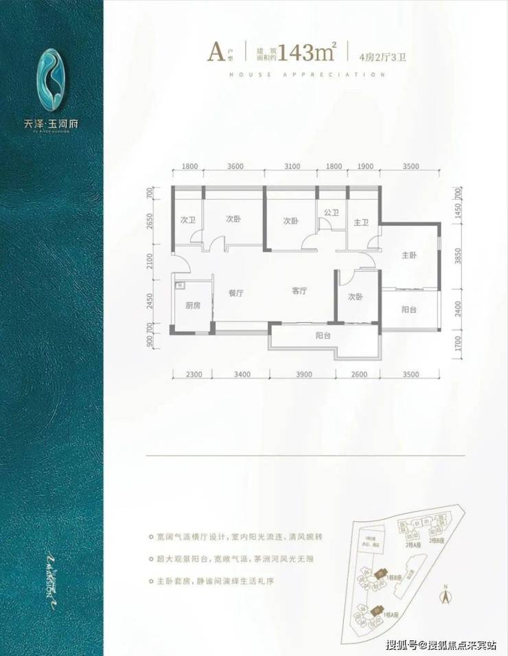 A户型-143㎡-4房2厅3卫,设计的是横厅南北通透格局,客餐厅开间7.3米,超大观景阳台6.5米长,全屋飘窗设计,主卧套房设计。