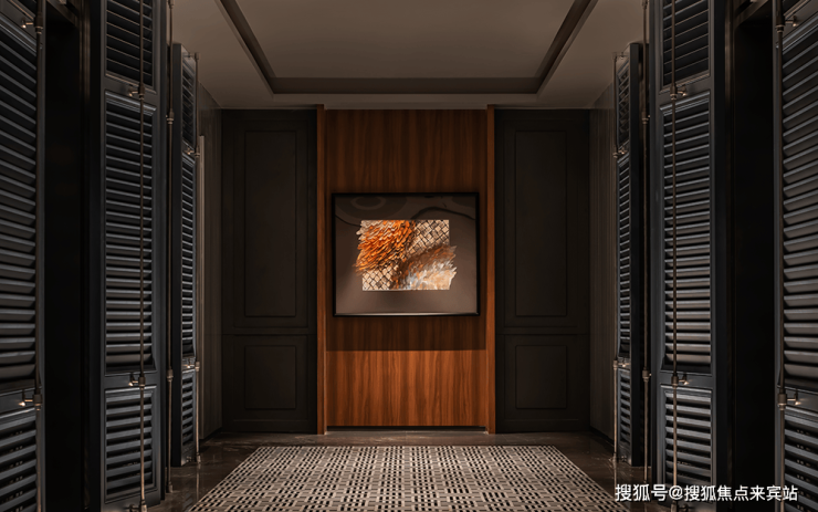 接待大堂的古典又现代的柱廊,造型简洁的天花呈现立体阵列状,无明显的中式符号,却显现出东方的庄重大气。地面法式的鱼骨纹拼接木地板,强化了空间视觉上的延伸感。吊灯、地面拼花、屏风及装饰画等元素的巧妙搭配,增添了空间的艺术气息,散发着独特的中法整合魅力。