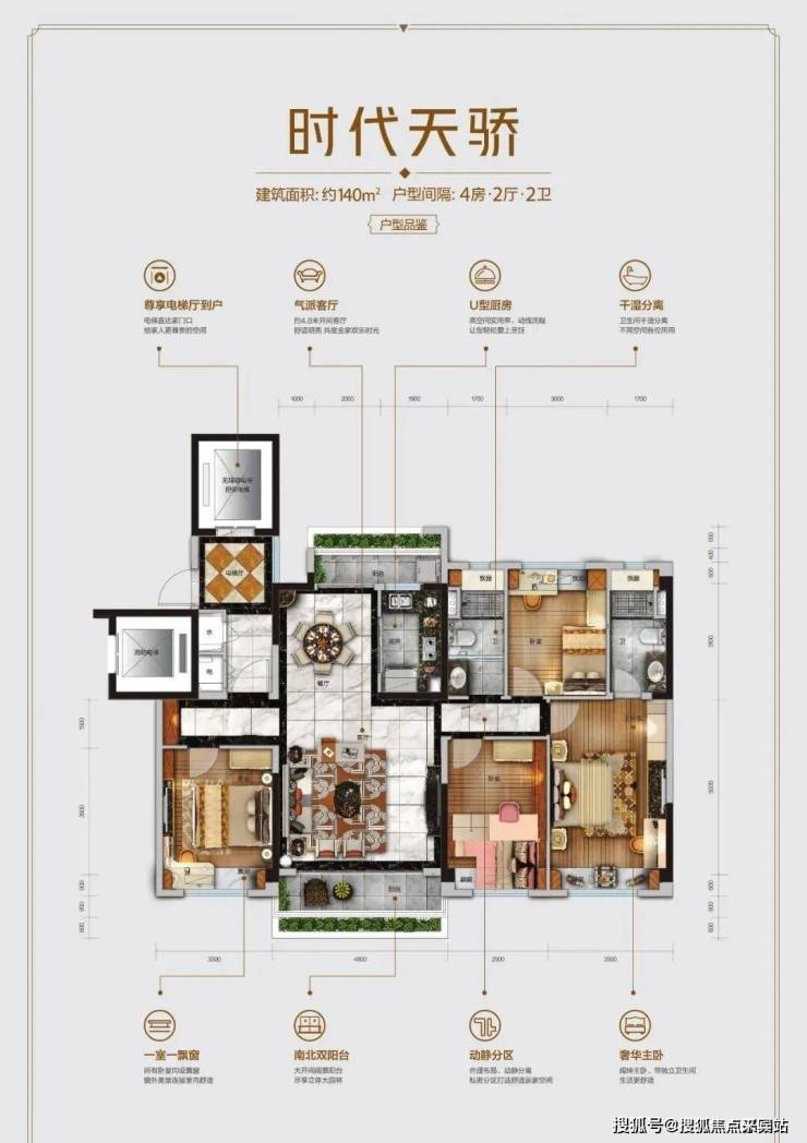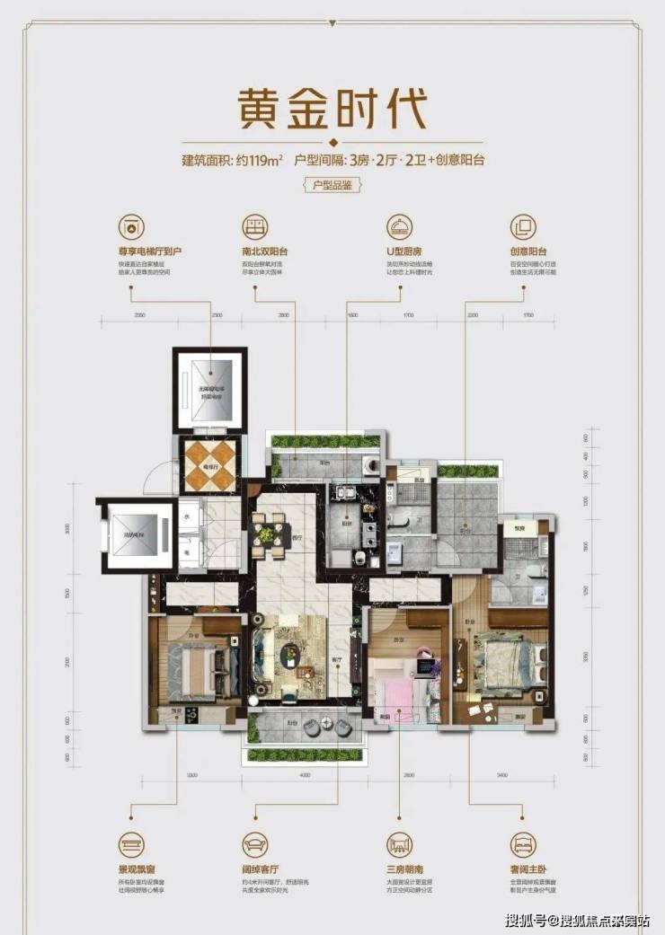 一、建面约119㎡,3房2厅+创意空间1、私家电梯厅到户,居住更私密2、双阳台设计,南北通透3、灵动创意空间,满足不同居家需求4、三房朝南设计,更贴合人性居住二、建面约140㎡,4房2厅1、私家电梯厅到户,居住更私密2、双阳台设计,南北通透3、二胎时代,一步到位4、干湿分区,符合居住卫生要求
