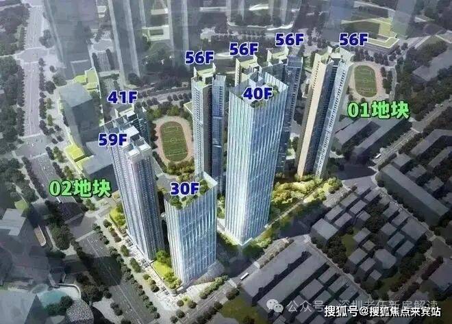 01-01地块占地约1.93万平方米,总建筑面积约23.8万平方米,容积率为8.81,绿化率为40.01%。该地块由1栋40层的办公单元和4栋56层的住宅单元,还规划有公交首末站。地块总规划980户,住宅单元设计为3梯4户、3梯5户和3梯6户,规划停车位1533个。