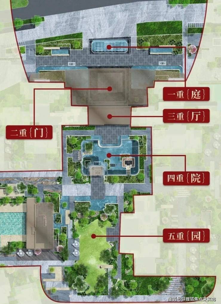 景观双轴,五重归家礼序,十大主题庭院:礼序前庭、琉光下沉式庭院、游泳池、社区会客厅、轻氧健身、亲子乐园、社区慢跑场等十大主题景观庭院。
