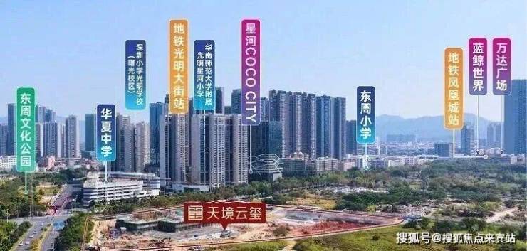 天境云玺(光明东周项目)项目位于深圳市光明区光明街道华夏路与周家大道交汇处,占地面积约34995.97㎡,总建筑面积约108487㎡,主要由9栋高层及部分裙楼组成。