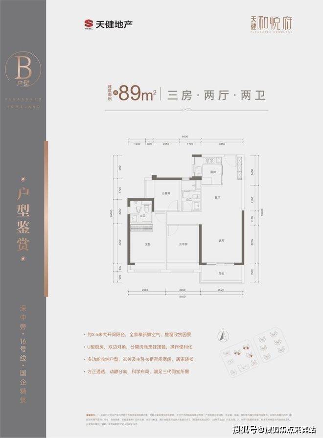 主力户型为约75㎡三房两厅一卫、89㎡三房两厅两卫、99㎡三房两厅两卫。天健和悦府