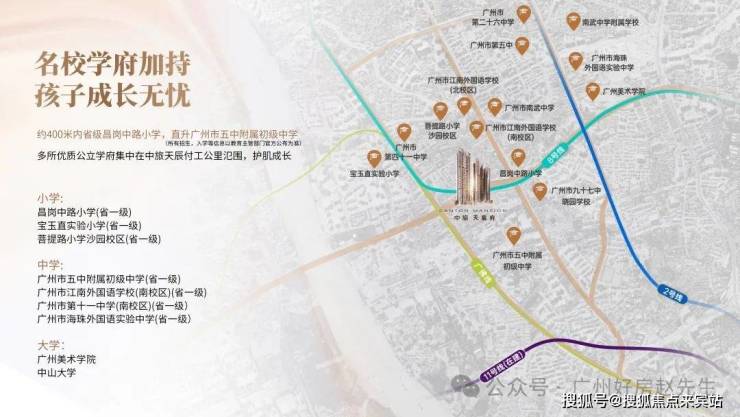 项目位于海珠区最强教育板块之一,根据海珠区教育局公布《2024年海珠区公办小学招生服务地段表》:中旅天宸府所属沙园街橡胶新村社区,约500米直距昌岗中路小学,符合就近入读条件。