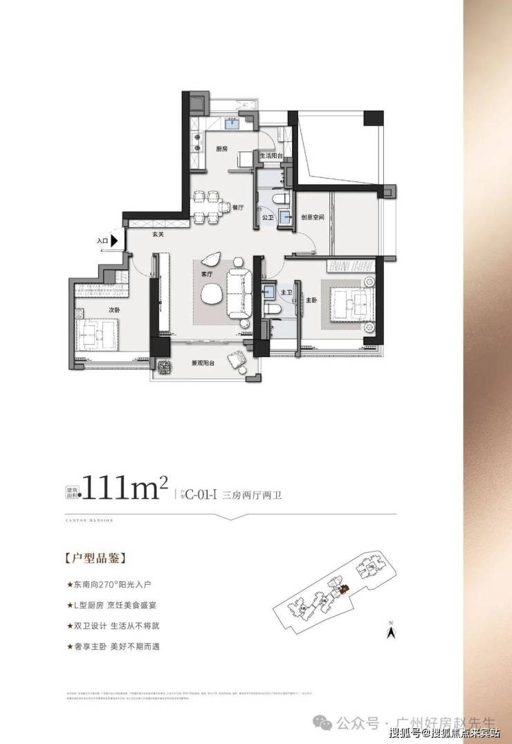 建面约111㎡三房两厅两卫精致3房设计,南北对流改善一步到位