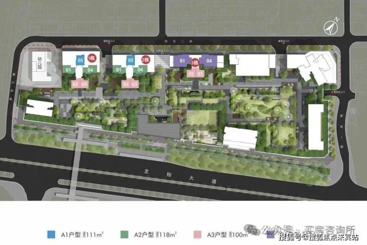 从规划效果图来看,项目共有3栋可售住宅、1栋回迁房、1栋人才房租赁、2栋公寓、1栋回迁公寓、1栋幼儿园。