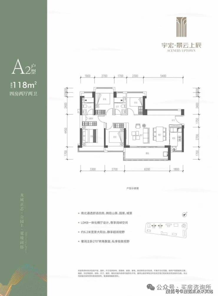 118㎡的4房2厅2卫,设计的是横厅南北通透格局,客餐厅6.2米开间,LDKB一体化,五开间朝南,西北面5.4米长的观景大飘窗,4个卧室分别做到了3.3米/2.7米/2.7米/2.3米的宽度,客厅连接餐厅位出6.2米长的大阳台,L型厨房,卫生间干湿分离,得房率约76%(不含赠送),东南朝向。