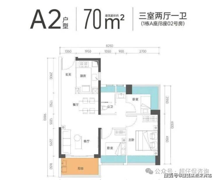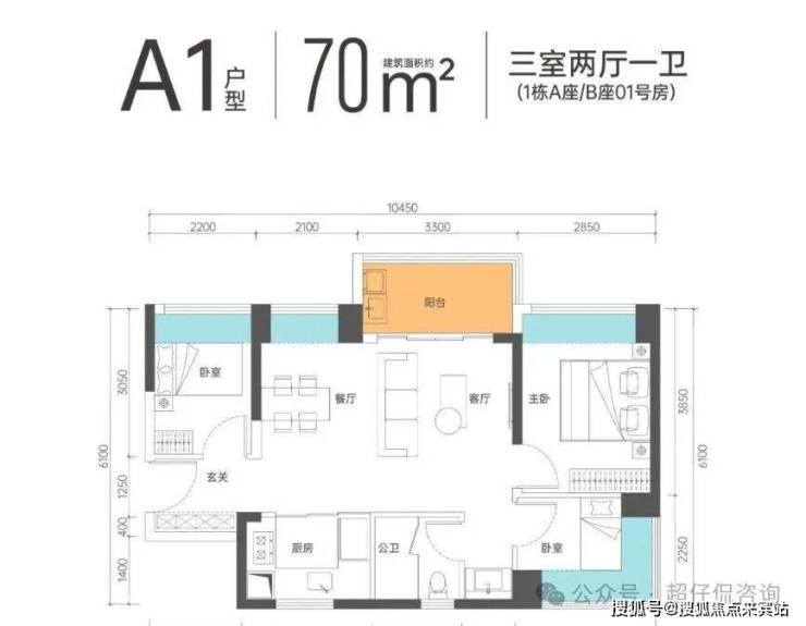 A1户型-70㎡的2房1卫,设计的竖厅格局,客厅3.3米开间,U型阳光厨房,有西南及东南朝向。
