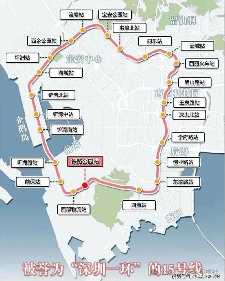 其中,地铁15号线是深圳首条环线轨道,起终点均为前海站,极速串联起前海、宝中、大铲湾、“腾讯科技岛(在建中)”、南山科技园、后海总部基地、留仙洞总部基地等高端产业密集区,是深圳最具有价值的一个圈。