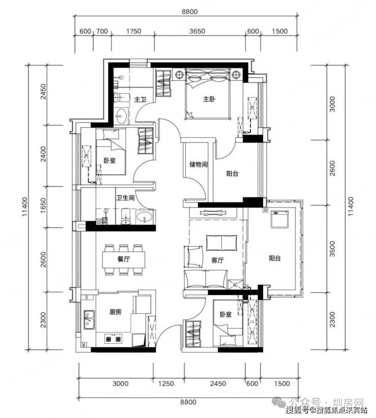 89㎡四房两厅两卫,同等面积多一间房,二孩家庭也能三代同堂。