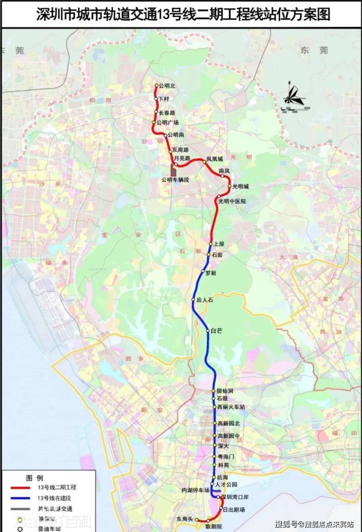 ①13号线及其南、北延长线(建设中,预计2025年开通)起于东角头站,终于公明北站,纵贯光明、宝安、南山,线路开通后约30分钟可抵达南山核心区,约45分钟可达深圳湾口岸,以高新技术人才为主要客流,被称为高新技术人才专线