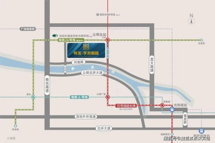 项目距13号线二期(北延)公明北站直线距离约200米,4站达公明广场,可换乘6号线通达宝安/光明/龙华/罗湖/福田