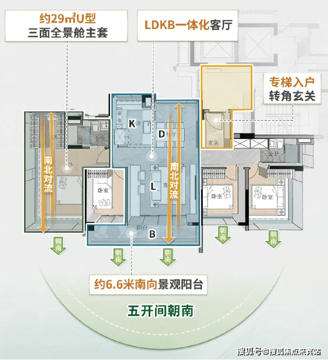 约14.7米南向面宽,餐客厅+主卧均南北通透,清风时时流连