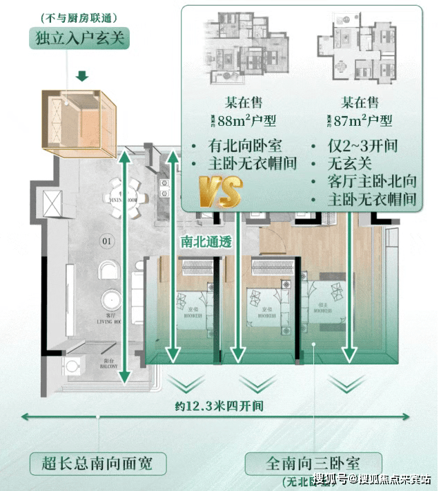 约12.3米总南向面宽,客厅和卧室均为南向布局
