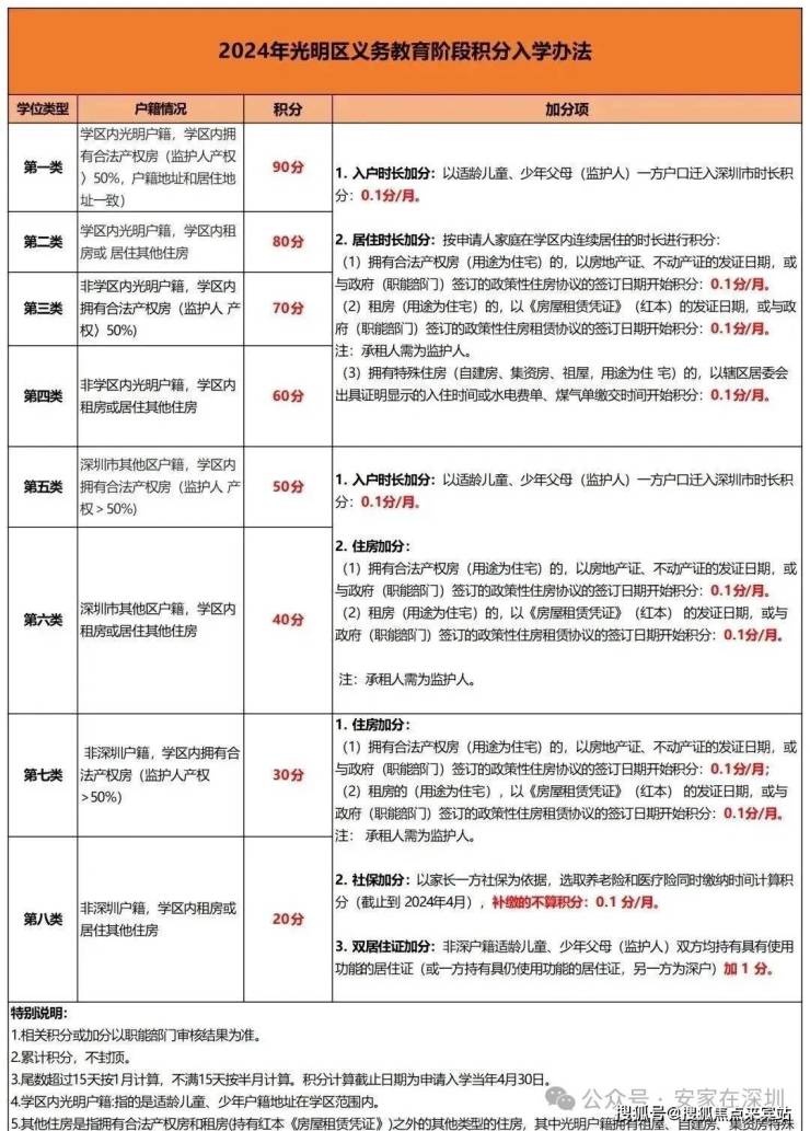 目前光明区义务教育阶段学位类型按照适龄儿童、少年户籍和家庭购房情况分为八类,积分项目及标准如下: