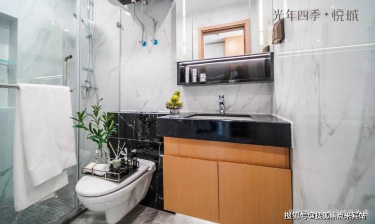 干湿分离的卫生间尺度,也比同类产品要大,且水龙头、花洒、马桶用的是TOTO (或同品牌),镜柜也是卡诺亚(或同品牌)。