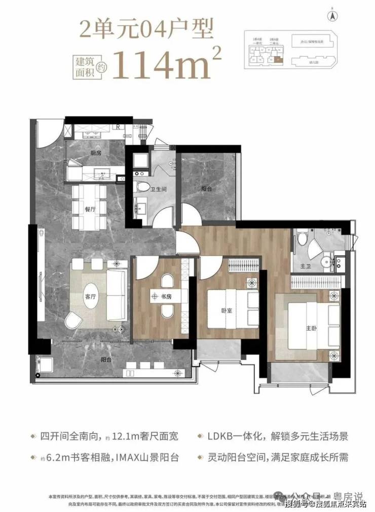 1栋2单元04户型,竖厅格局,客厅3.85米开间,LDKB一体化设计,动静分区,四开间朝南,12.1米面宽,二字型厨房,卫生间干湿分离,客厅连接次卧出6.2米长大观景大阳台,正南朝向。