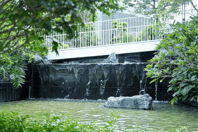 虽体量小,但社区园林也做了许多小巧思。比如,穿过大门,是多层栈道与绿植组合的宽幅叠瀑水景,提升游园的空间立体感。