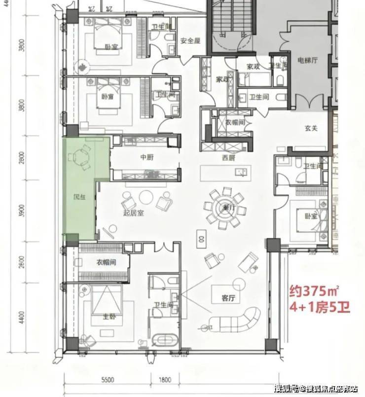 约500㎡户型入口结合入户阳台为对景,东侧配置超大尺度餐客厅,西侧以家庭厅为核心,配置了四卧全套房。