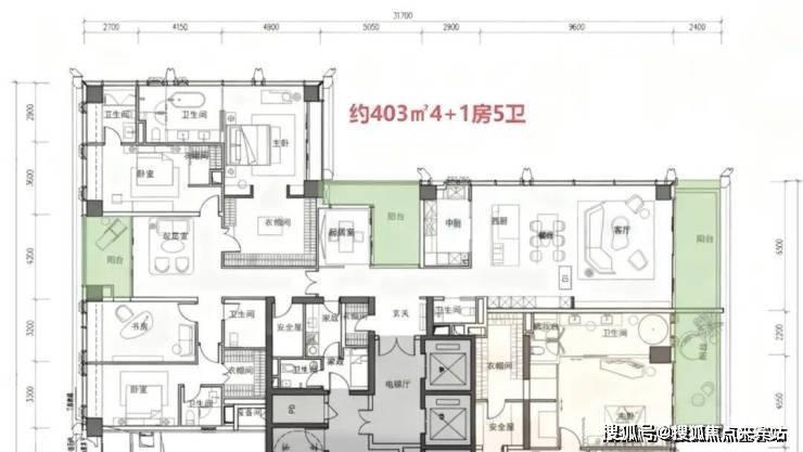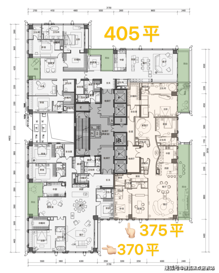 ——高区 40F起(150-200米)是约370-375-403㎡4+1房五卫+家庭厅+家政套间;