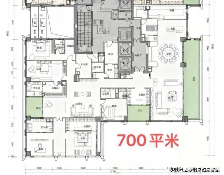 700平客厅约13.5米进深、开间约11米。阳台开间约15.5米,5房(4套房)