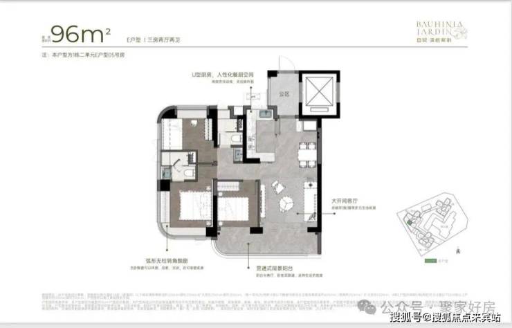 96m²三房两厅两卫的E户型:竖厅格局,拥有超宽客厅,LDKB一体化设计,动静分区。三开间朝南,得房率高达92-100%(含赠送部分)