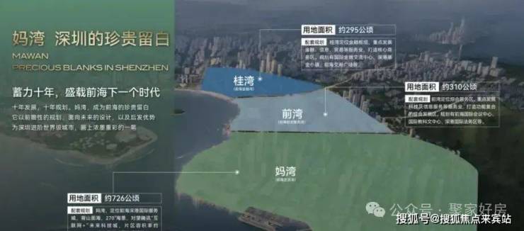妈湾拥有山海合一资源,背靠大小南山,对望腾讯科技城,生态资源丰富。面积726.5公顷,容积率1.28-1.48,是低密生态豪宅住宅区的理想选择。官方策略是先建设配套、发展人才,再建房,促进妈湾与前湾、桂湾的协调发展。