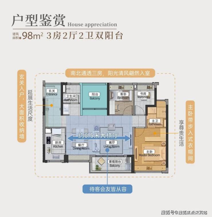 建面约98m²南北通透珍罕四房,约6.5米大横厅,待客会友皆从容