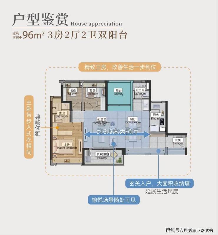 建面约96m²南北通透四房,约6.5米大横厅,延伸生活尺度