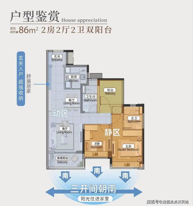 建面约86m²东南向望园三房两卫,经典竖厅设计,南向正望园林