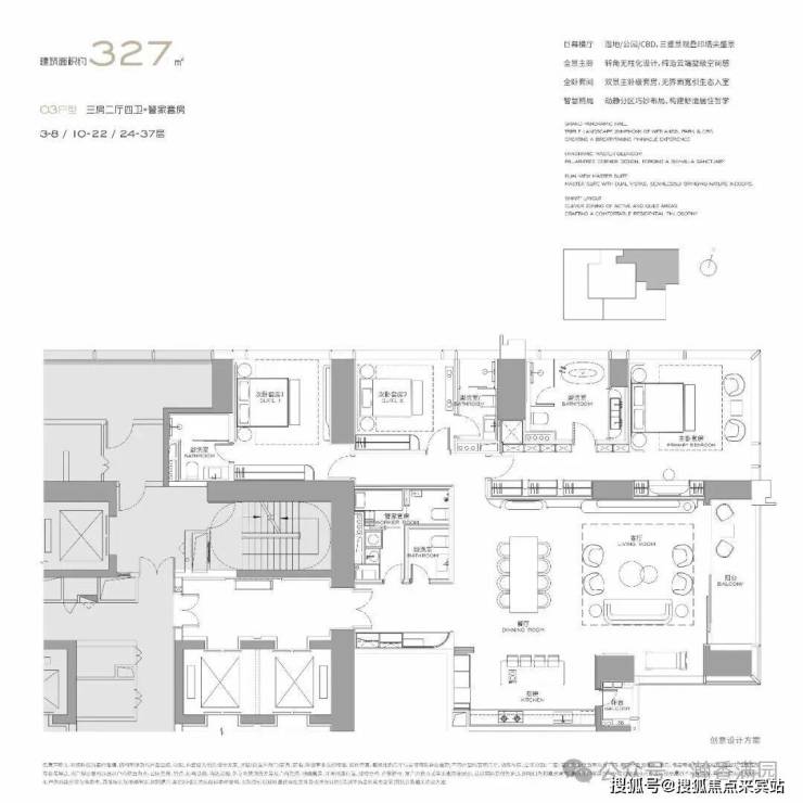 建筑面积约327平方米,三房二厅四卫+管家套房 3-8/10-22/24-37层