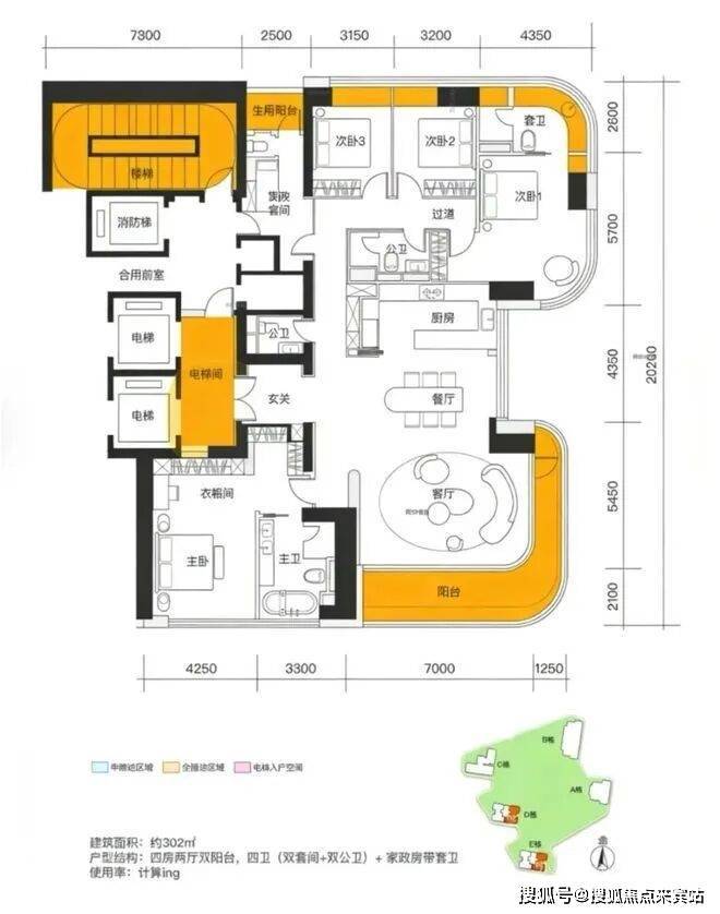 分布于D座和E座,3梯2户设计,专梯入户保障私密性。户型采用弓形结构,家政套间与采光面设计为亮点,270°环幕景观阳台可最大化享受海景视野(20层以上视野更佳)。作为项目首推户型,该户型性价比突出,总价约5000万内,在同价位段具备较强的市场竞争力,适合追求空间舒适度与景观体验的高净值家庭。