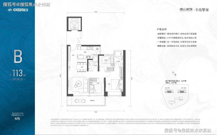 「南山1978·半岛擎峯」提供两种主力户型,分别是113㎡3房2卫和124㎡3+1房2卫,这些户型位于2至30层,均设计为全朝南向,并配备6.5米宽的宽敞阳台。
