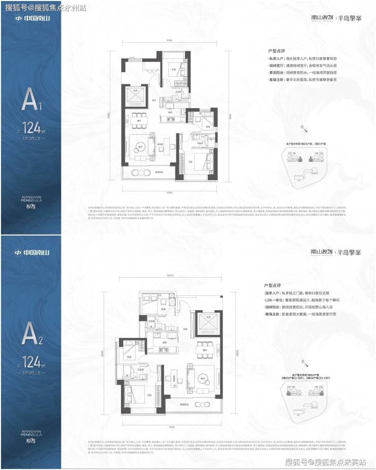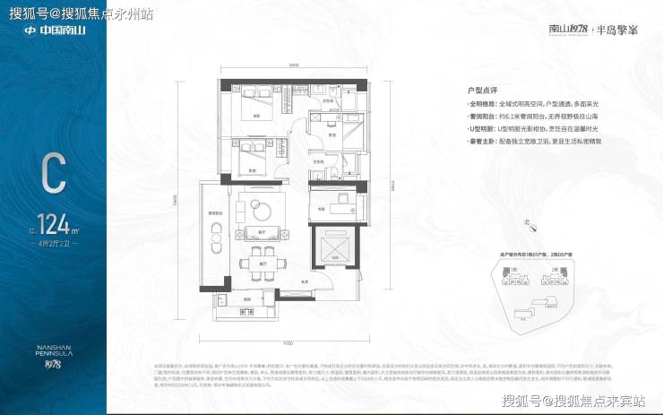 124㎡3+1房二卫 :该户型为3+1房二卫,专梯入户的竖厅设计,户型朝西南向,直面海景。