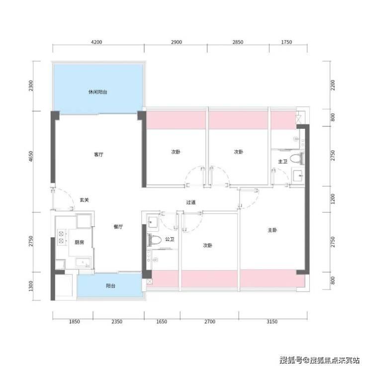 112m²的4房2厅2卫,竖厅南北通透格局,客厅4.2米开间,客餐厅分离化设计,南北双阳台,四开间朝南,动静分区,U型厨房,卫生间三段式干湿分离,客厅大阳台9.66m²西北朝向。得房率约78.8%(不含赠送),加上赠送面积后得房率约94.72%。
