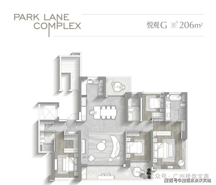 建面206平,一层虽然共有三户,但是每户带独立电梯厅,南北对流设计,南向阳台长约9.3米,13栋直面长隆欢乐世界景观非常好,双主套。