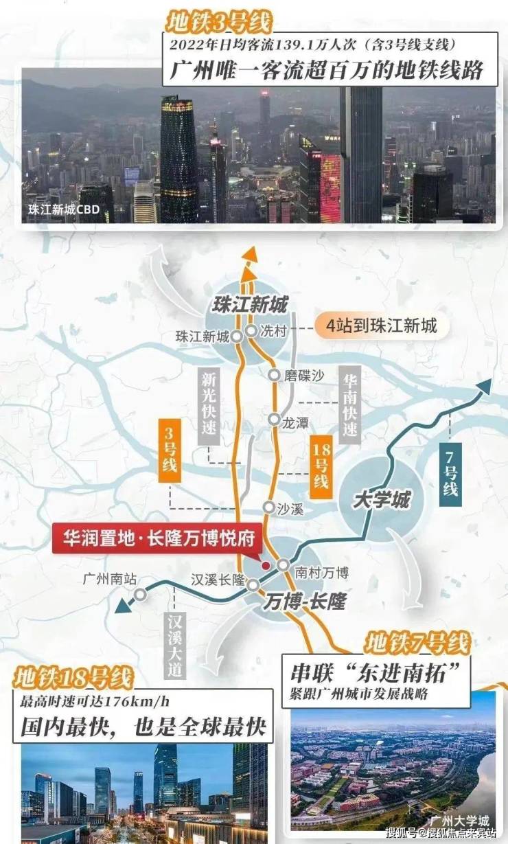 华润悦府的位置交通是非常方便的,地铁的话3/7号线地铁口汉溪长隆站大约400米,还有专门的地下通道直达地铁口,长隆站还有一条佛莞城轨,跨越5个城市。另外到南村万博站就得一点多公里了,可以做18号线。