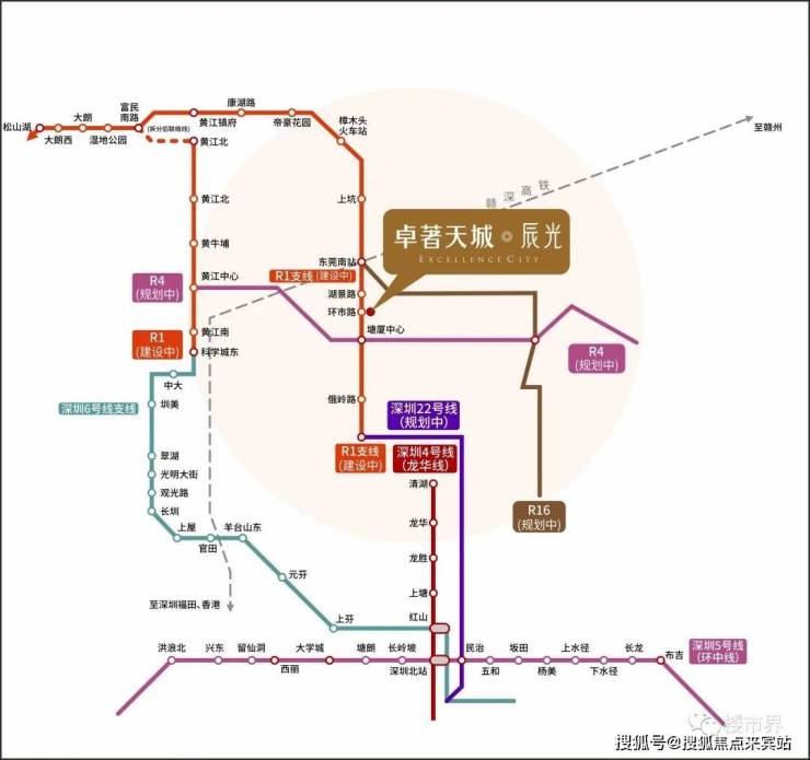 毗邻地铁·3站到深圳:近享R1线环市路站(规划中),未来接驳深圳22号线(规划中),3站快速链接深圳,速达深圳龙华、福田等地;地铁R1线支线与深圳22号线接驳后,将实现福田主中心与观澜组团中心45分钟、塘厦60分钟通达的规划目标