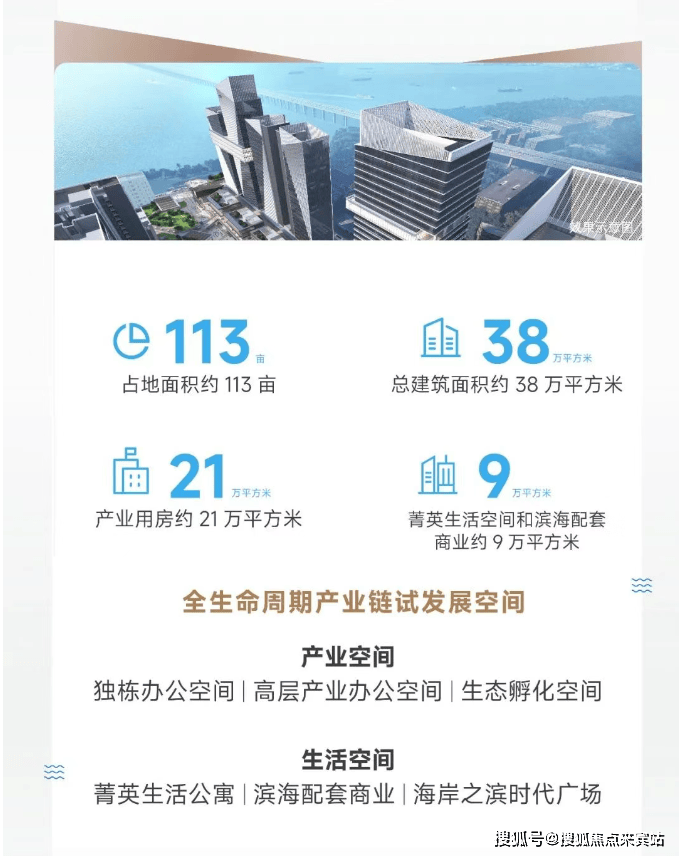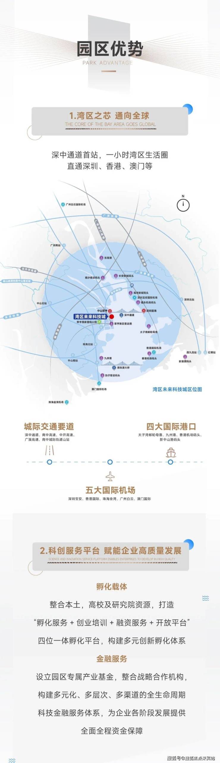湾区未来科技城是广东省重点建设项目、中山市重点产业平台项目,建设历时4年多。园区紧邻深中通道登陆点,占地面积约113亩,总建筑面积约38万平方米,总投资约27亿元,拟打造产业全生命周期企业办公集群和配套生活空间,物业形态包括约21万平方米产业研发用房、约9万平方米生活宿舍和滨海商业配套。