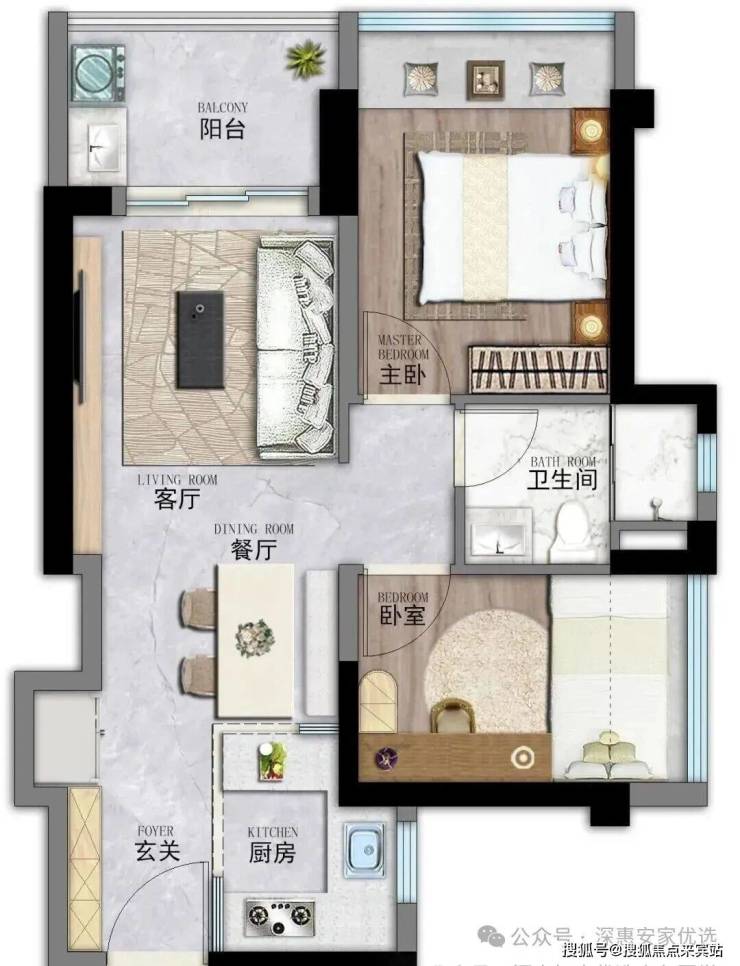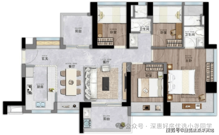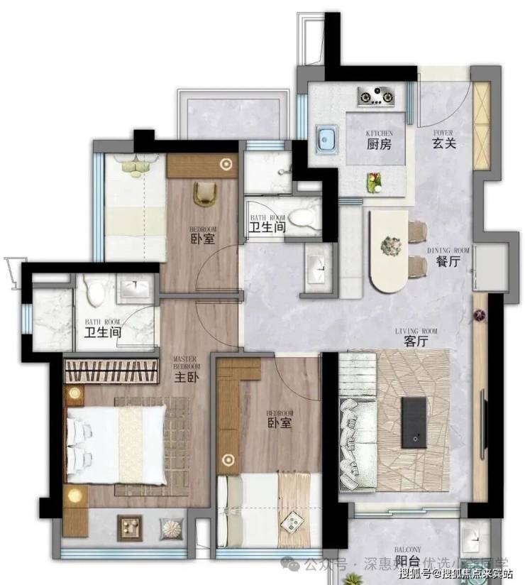 86㎡三房:三开间朝南,主卧套房设计-。
