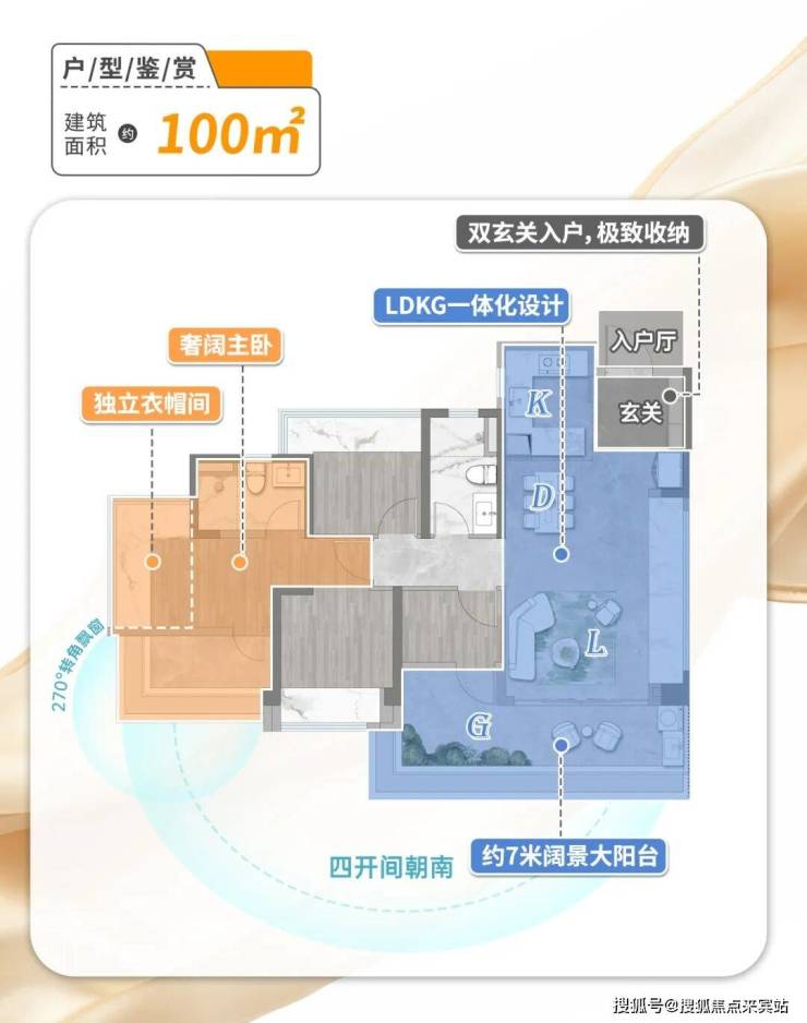建面100㎡四房两卫:海珠罕见百平内正四房,4.1米方正厅堂,7.2米大阳台,独立主卧套间,270°转角飘窗提升采光与景观视野。