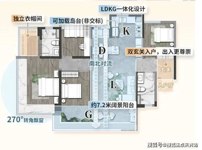 建面120㎡四房两卫:南北通透设计,28㎡南北对流方厅,中西分厨配置,7米阳台联通次卧,主卧带独立衣帽间。
