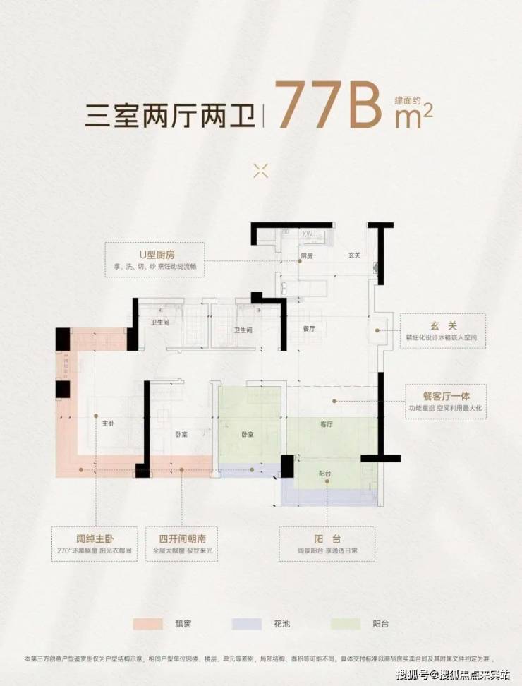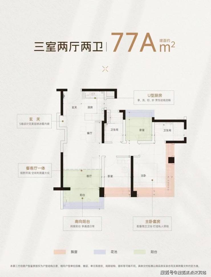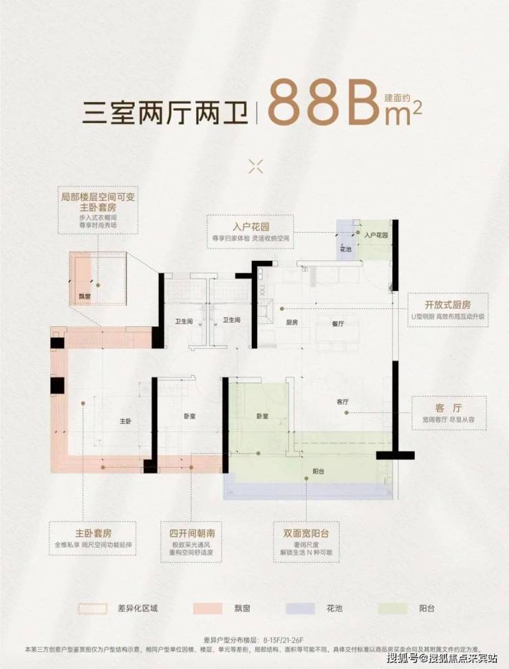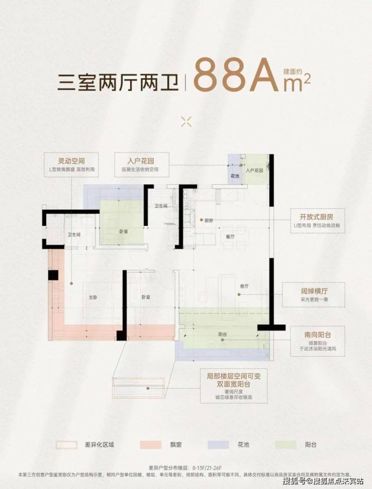 88㎡户型:这个户型是主力户型,相比于 77㎡户型,主要是进行了阳台尺寸的升级,同时多了一个灵动空间。