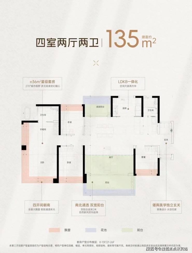 105㎡户型和 135㎡户型:都做成了横厅的布局,105㎡户型客厅面宽近 5 米,通铺阳台使整个客厅面积可扩充至 23 平米。
