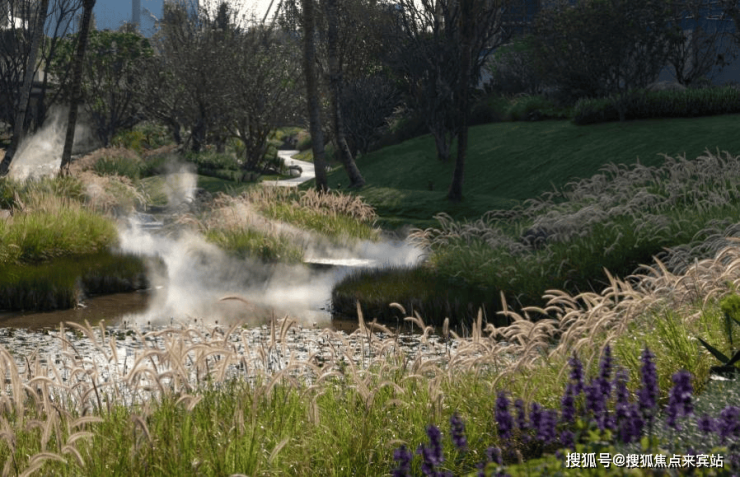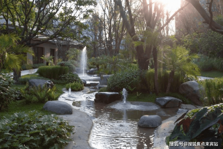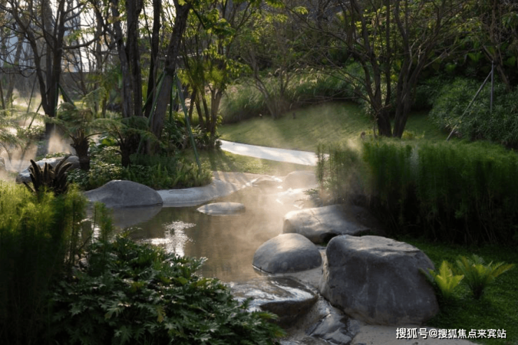 雨林溪谷作为整个项目中最重要的公共景观带,以“溪水”元素贯穿,设计利用其天然的地形高差,形成了由上而下的坡地式峡谷自然空间格局。