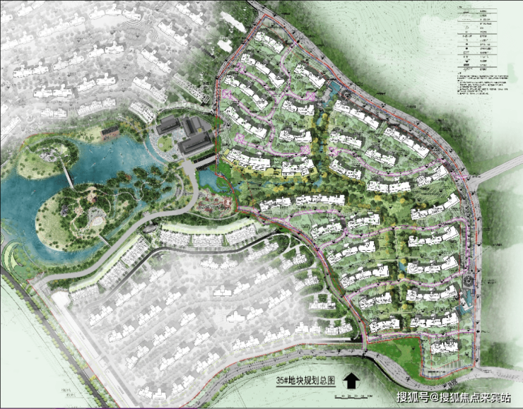 我们以“溪”元素贯穿,水以不同的尺度、形态迂回于整条景观带中。峡谷空间由西向东逐渐变窄,活动空间由动至静。草坪连接着池塘,利用高差错落塑造了野趣的乡野画面(图3、图4)。