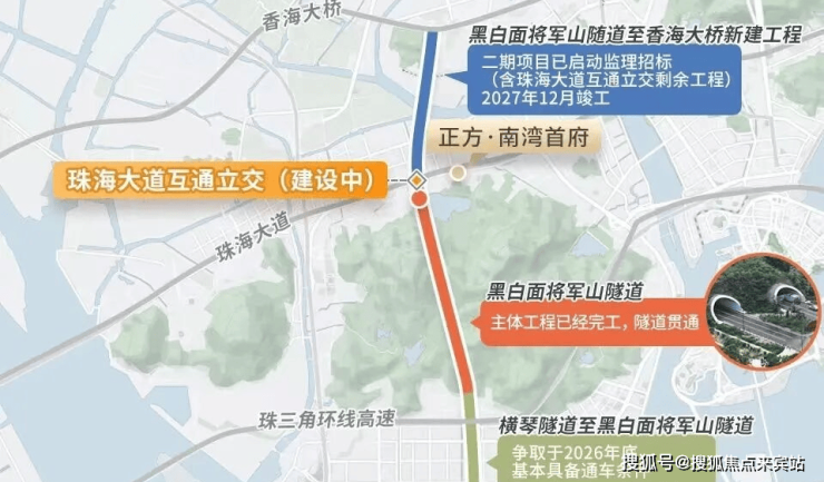 未来周边小区业主即可在该区域完成调头,避免了绕行前行调头的问题,黑白面将军山隧道至香海大桥:2024年10月16日,官方公布了该段及珠海大道互通立交剩余工程的招标信息,计划2027年12月竣工。