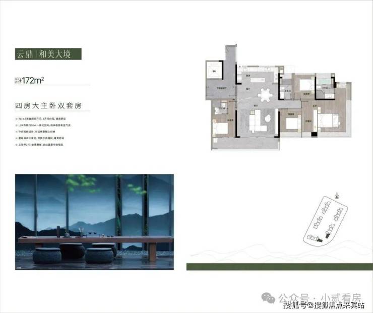 172㎡|四房大主卧双套,约18.5米奢阔总开间,5开间向阳,通透舒适,LDK布局约50㎡一体化空间,阔绰格局彰显气派,主卧带270°全景飘窗,云山盛景尽收眼底